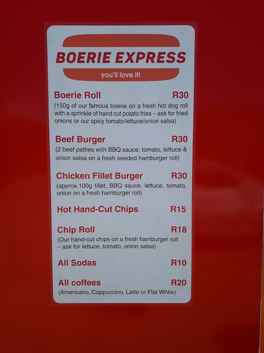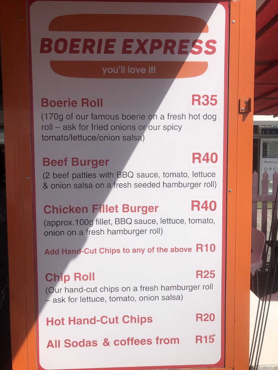 Welcome to Boerie Express, where the essence of authentic South African fast food comes alive! Nestled in Brooklyn, Cape Town, this unassuming kiosk specializes in mouthwatering boerewors rolls, topped with perfectly fried onions, and served on a fresh roll for just ZAR 40.00. Their flavorful beef and chicken burgers, richly layered with BBQ sauce, lettuce, and tomato, start at ZAR 45.00 and are a must-try for any burger aficionado.